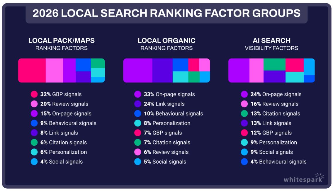 AI twists: It infers deeper context, scanning for proof like before/afters or pricing guides. Whitespark's data shows behavioral signals rising in AI contexts.